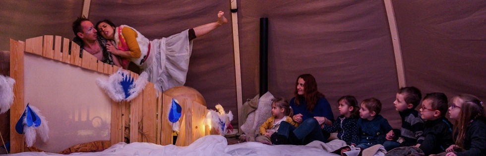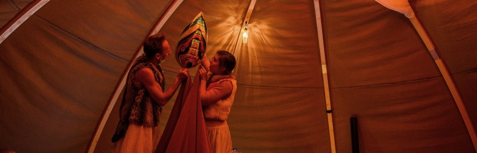 Deux personnages vous initient à un voyage sensible et sensoriel. Il vous suffit d’entrer en peau à peau sur un tapis de peaux textiles et de vous laisser guider. Du cercle polaire vers l’équateur, de la protection vers le lâcher prise Dinuit et Siou affûtent nos perceptions et nous connectent à nos sensations primitives.
